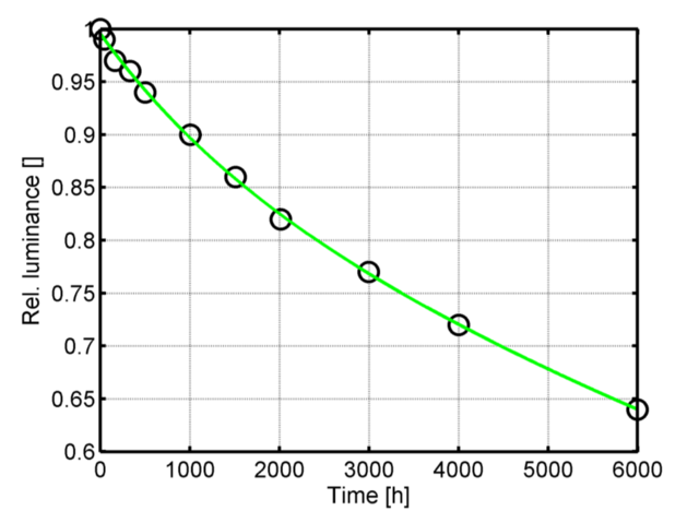 При почти постоянных условиях (одинаковая яркость, температура, ток) износ не является «почти линейным» во все времена, но имеет экспоненциальный характер.