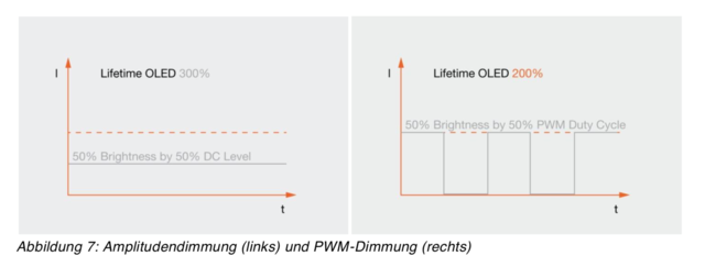 - Снижение среднего тока OLED посредством широтно-импульсной модуляции (ШИМ) увеличивает срок службы OLED только пропорционально, но сохраняет цветовую точку стабильной для белых OLED.[/q]Со временем все дисплеи теряют контраст, цвет и яркость. Это также отражается в том факте, что панели имеют определенный срок службы с 50% вышеуказанных параметров. Падение параметров не является линейным. В первые годы падение было относительно низким, и это падение было компенсировано встроенной системой постепенного увеличения напряжения питания и, тем самым, компенсации некоторой яркости. После этого снижение резко возрастает в конце указанного периода жизни. Проблема этого процесса старения заключается в том, что он изначально постепенный и, следовательно, ползучий.