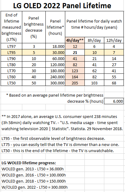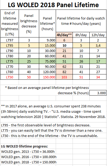 Как расшифровать эту таблицу. то есть если использовать тв 12 часов в день на протяжении 4 лет он потеряет в яркости 3%? и как вообще они могут делать такие предположения если OLED массово начали производить всего-то 5-6 лет. есть тут владельцы ОЛЕД c пробегом 13-14 тысяч часов просмотра. Сколько Оледов дожили до 15 тыс часов просмотра? вот вопросы которые более актуальны и интересны... а ведь это не так много...14.400 часов это при моём использовании 10 часов в день всего 4 года.