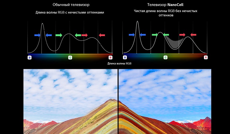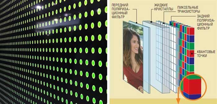 Слой состоит из крошечных частиц, каждая из которых излучает свой собственный индивидуальный цвет в зависимости от её размера (от 2 до 10 нанометров). В основном, размер частицы определяет длину волны света, которую она испускает и, следовательно, различные цвета. LG может похвастаться тем, что квантовые точки позволяют отображать более миллиарда цветов при более высокой, чем у обыных ЖК телевизоров, яркостях. Фирменная технология с квантовыми точками от LG называется NanoCell