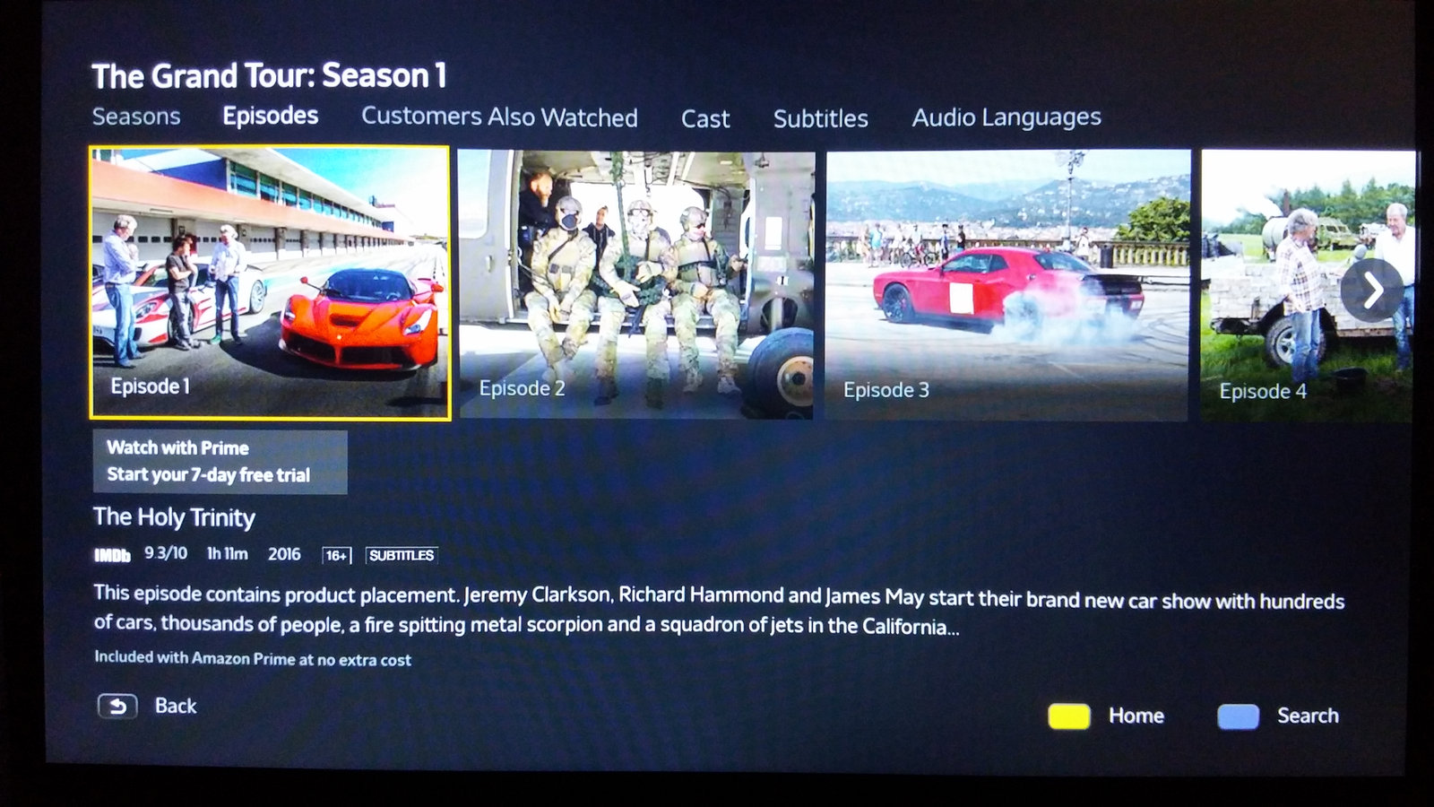 Кликаем по постеру автомобильного шоу бывшего ведущего Top Gear Джейми Кларксона "The Grand Tour". Открывшаяся страничка предлагает информацию по текущему эпизоду (рейтинг на IMDB, год выпуска, длительность, наличие субтитров), однако понять качество материала нас ожидает (720p/1080?, HDR?), понять нельзя. Подписчикам сервиса Amazon Prime предлагается сразу же бесплатно посмотреть контент (watch with Prime). Остальные пользователи могут воспользоваться для начала 7-дневным пробным доступом.