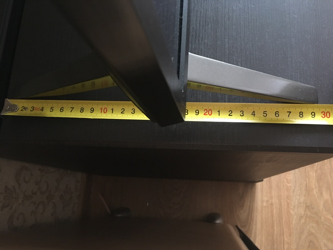 После заказа сразу задумался о транспортировке. Размер упаковки 170x107x22,5 сантиметров, поместился в багажник старенького паджеро спорт, правда под углом. Подняв тв домой первым делом озадачился, как его поставить на ножки. Распаковав, увидел не богатую комплектацию: ножки с крепёжными болтами, пульт с батарейками, тоненький сетевой шнур, сертификат иви и эконом книжка гарантия/инструкция. Согласно инструкции, положил тв горизонтально, прорезал упаковочную плёнку и прикрутил ножки (на ножках и самом тв подписано А и В). Следующим шагом установил тв на тумбу шириной 159.5 см. и был немного удивлён, как мало места осталось от ножек до краёв тумбы - сделал замеры самих ножек, ширины их установки и насколько тв можно придвинуть к стене на ножках.