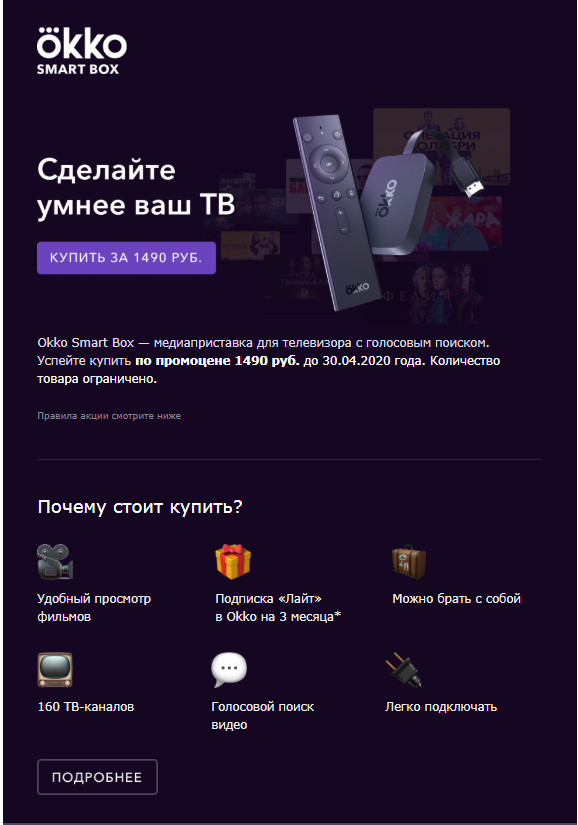 Акция только для новых пользователей! Регистрируйтесь в сервисе, активируйте промокод и получите целый месяц подписки бесплатно. Можно посмотреть сериалы и программы намного раньше, чем по ТВ.