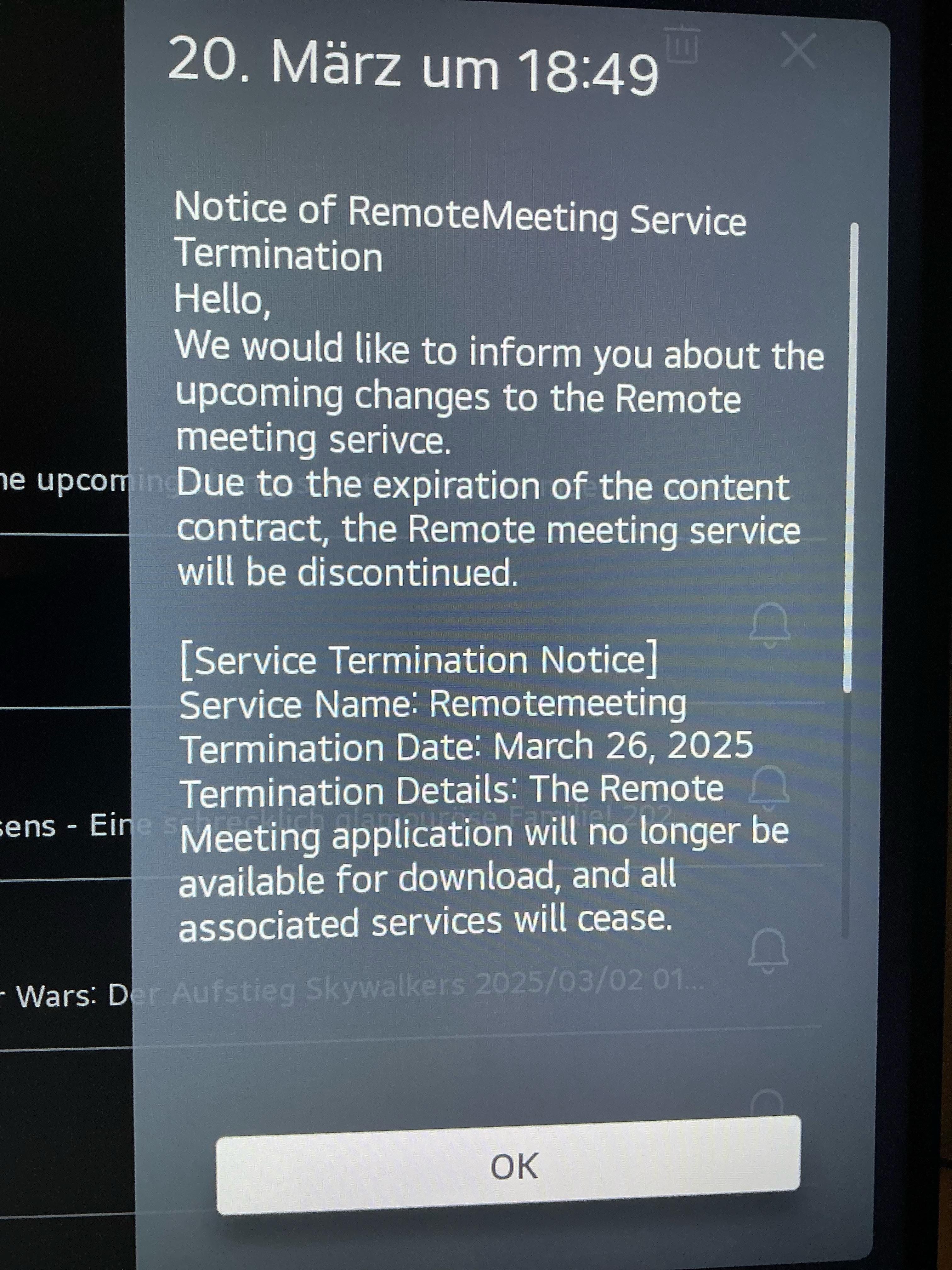 На reddit недавно написали, что сервис Remotemeeting в скором времени перестанет быть доступен для скачивания. Ряд пользователей получили вот такое сообщение на свои телевизоры LG: