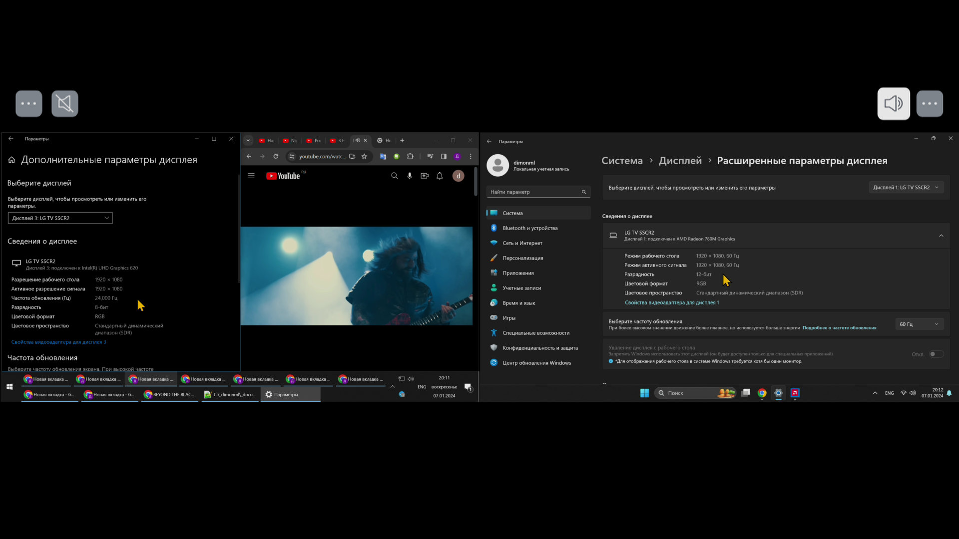Два окна рядом, на каждый из них можно выбрать любой HDMI порт, максимальное разрешение на компе 1920x1080, герцовка до 60 Hz, SDR (HDR включить не дает), 8-10-12 бит.