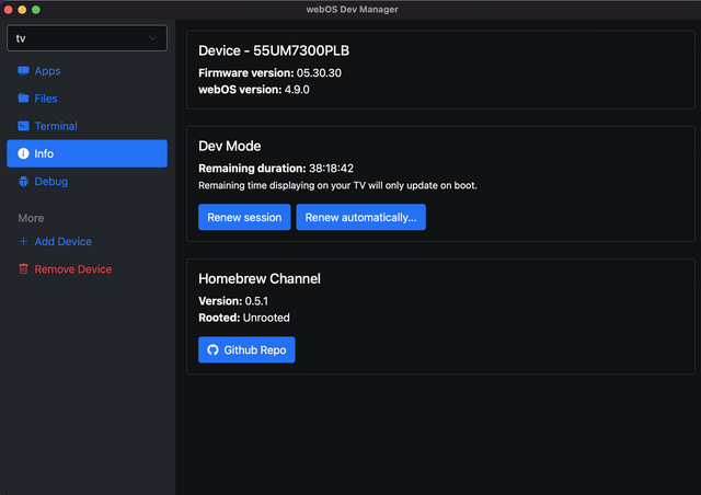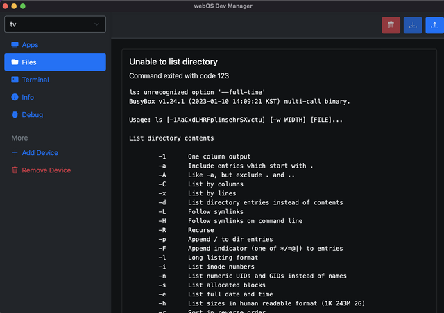 Начал делать вот по этой инструкции, но споткнулся на 5 пункте, почему-то нет доступа к файлам на телевизоре. Попробовал несколько версий Dev Manager (1.97, 1.96, 1.95, 1.94), чтобы исключить проблему с программой, но везде при нажатии на раздел "Files" ошибка: "Unable to list directory"