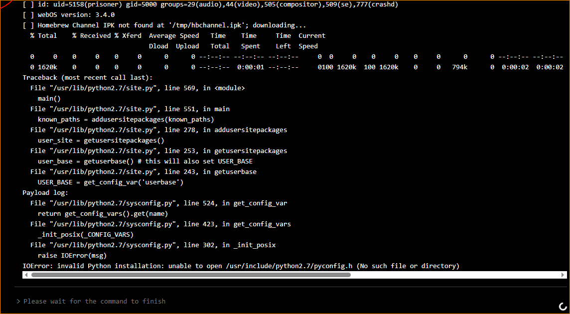 JackSparrow @ [rootmy.tv] Как получить Root права на webOS (к стати автор внес изменения в команду, в инструкции тоже нужно поменять curl -L -o /tmp/autoroot.sh -- 'https://raw.githubusercontent.com/throwaway96/faultmanager-autoroot/refs/heads/main/autoroot.sh' && sh /tmp/autoroot.sh) но к сожалению скрипт не сработал, появилась ошибка, может кто сталкивался, помогите пожалуйста! Тв uh603v, файрволл версия 05.70.50, прошивка 3,4,0