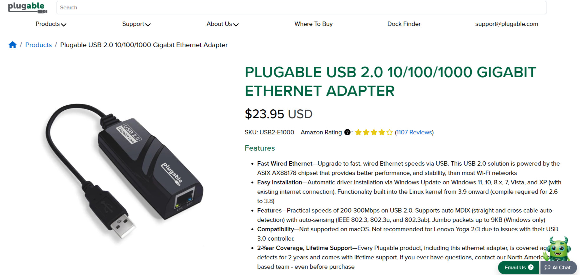 Интересно, что на сайте производителя предлагается купить адаптер Plugаblе Technоlоgies USВ2-E1000 за 24 доллара, то есть около 2000 рублей 8-).