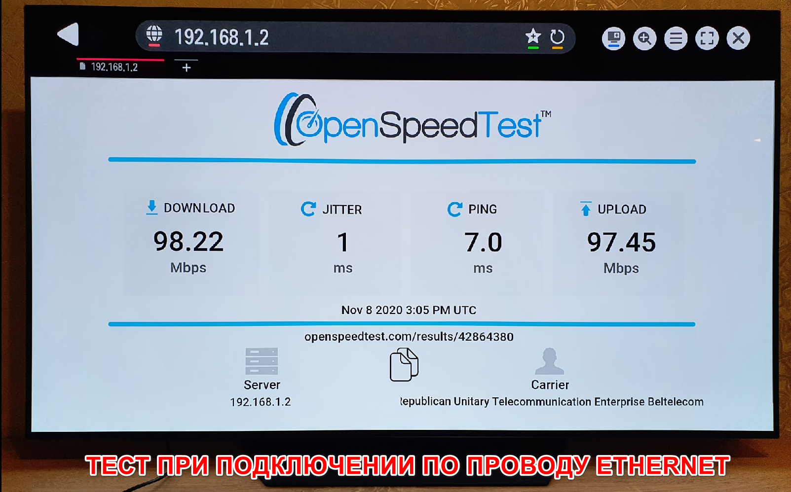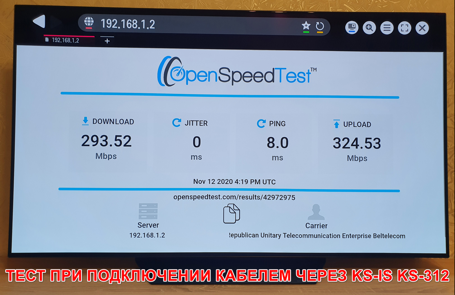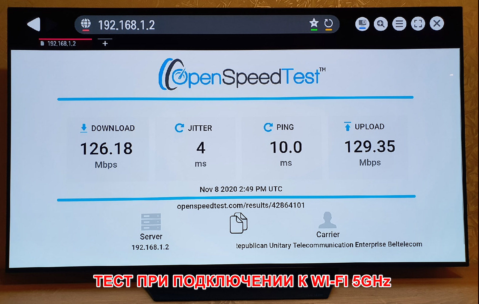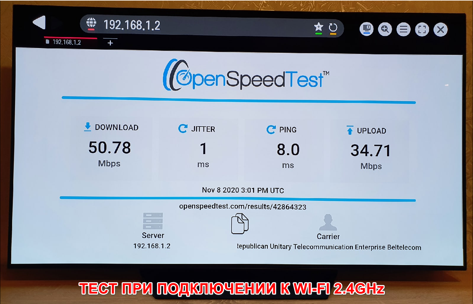 Итак, роутер Keenetic KN-1010, находится на расстоянии 8м от ТВ OLED55B9PLA, между ними по диагонали преграда, угол из двух бетонных панелей.