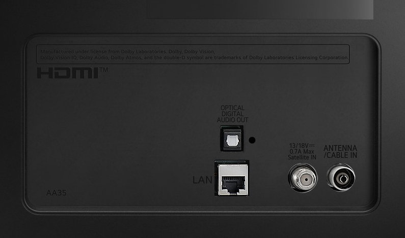 Задняя панель телевизора LG LQ630B оснащена следующими интерфейсами: 2 антенных входа (спутник/кабель) и 1 порт LAN. Что касается аудио, то на этой же панели расположен только оптический аудиовыход, а выход 3,5 мм для наушников и выход аудио RCA (тюльпан) на два канала отсутствуют.
