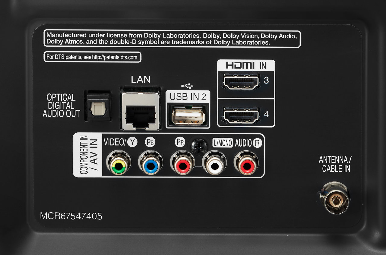 Задняя панель телевизора LG UM7610 оснащена следующими интерфейсами: два входа HDMI, 2 антенных входа (для спутникового и кабельного/эфирного ТВ), компонентный AV-вход (в версии для США), один порт LAN (со скоростью 100 Мбит/сек), один порт USB (версии 2.0). Что касается аудио, то на этой же панели расположен только оптический аудиовыход, выход 3,5" для наушников отсутствует.