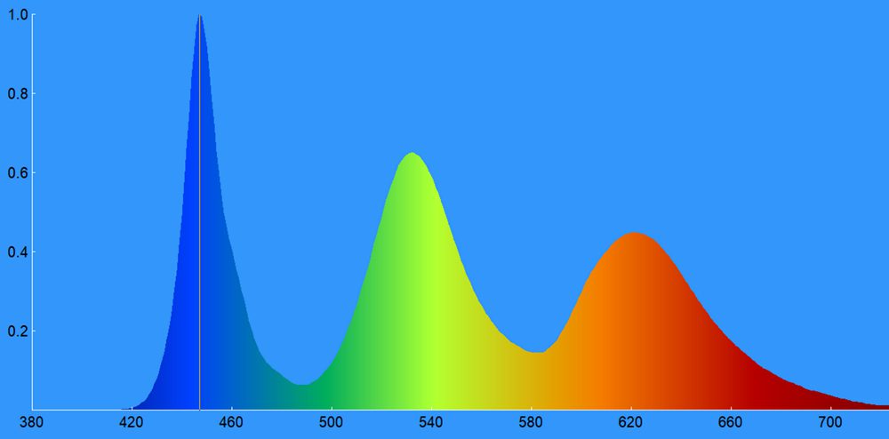 Спектральный анализ белого цвета (режим кинопроизводителя) показал наличие трех четко выраженных областей излучения в диапазонах R, G и B. Можно заметить отсутствие разделения излучения в зеленом и красном диапазонах, что может указывать на отсутствие чистого B > Использовалась конверсия R.G с КТ (квантовыми точками), но какое-то гибридное решение.