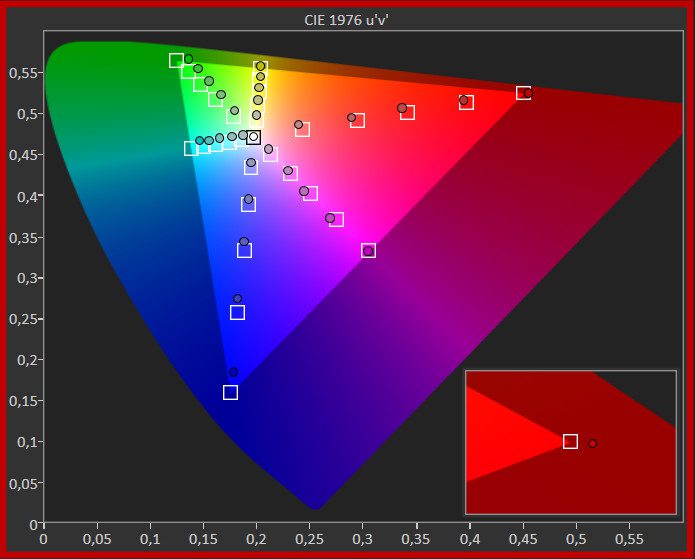 Покрытие пространства UHDA-P3 (CIExy) составило 82%, что довольно мало для телевизора с квантовыми точками. На мой взгляд, виной этому состоянию являются недостатки воспроизведения сильно насыщенного зеленого цвета.
