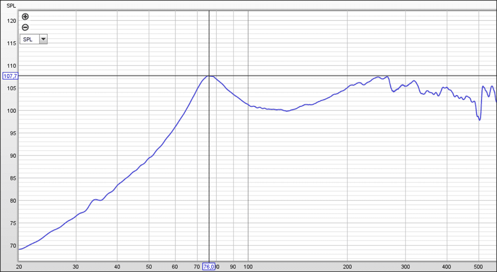 Измеренная в ближнем поле в диапазоне 20-1000 Гц, частотная характеристика показывает значительное снижение примерно с 247 Гц, а примерно на 76 Гц сильное повышение из-за схемы фазоинвертора.
