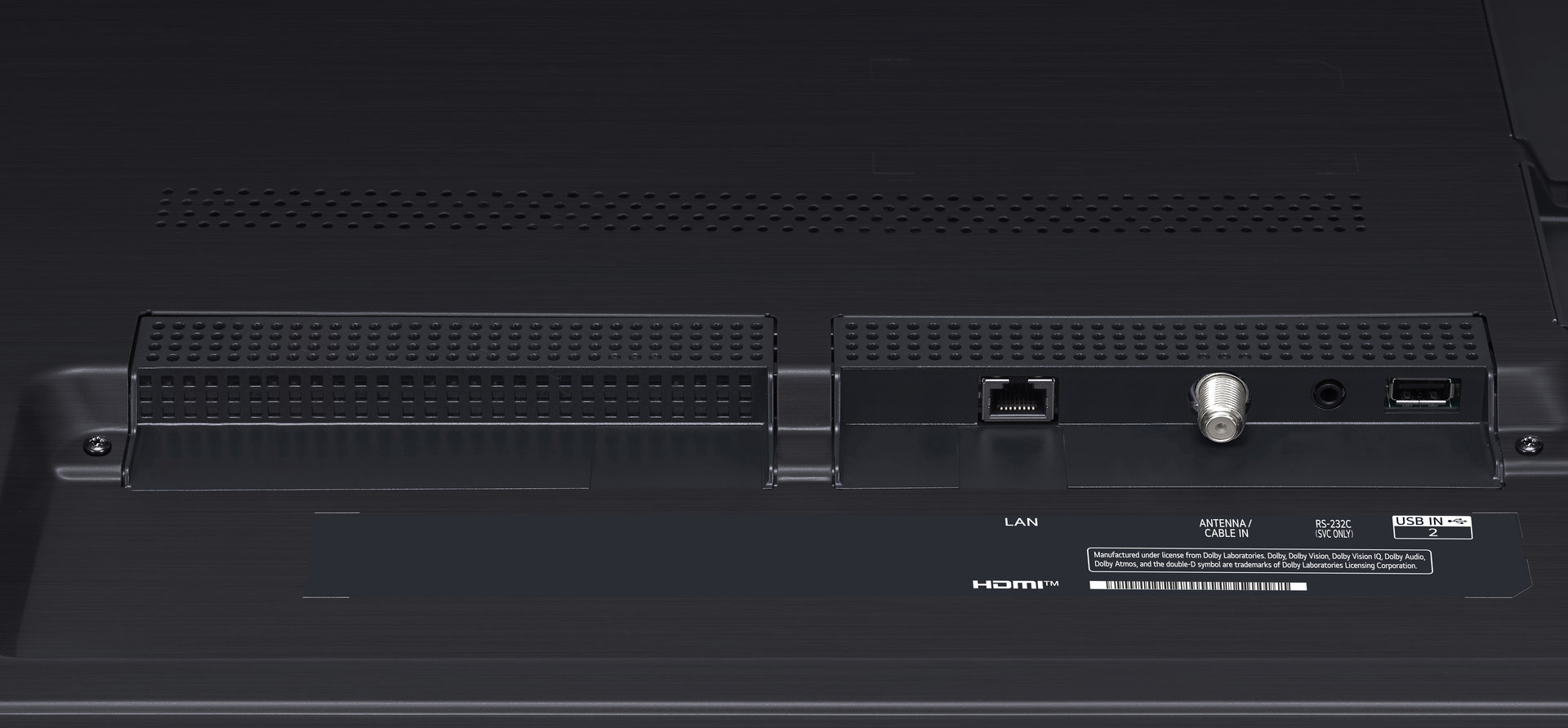Нижняя панель телевизора LG QNED85 оснащена следующими интерфейсами: 2 антенных входа (для спутникового и кабельного/эфирного ТВ), один порт LAN (со скоростью 100 Мбит/сек), один порт USB (версии 2.0).