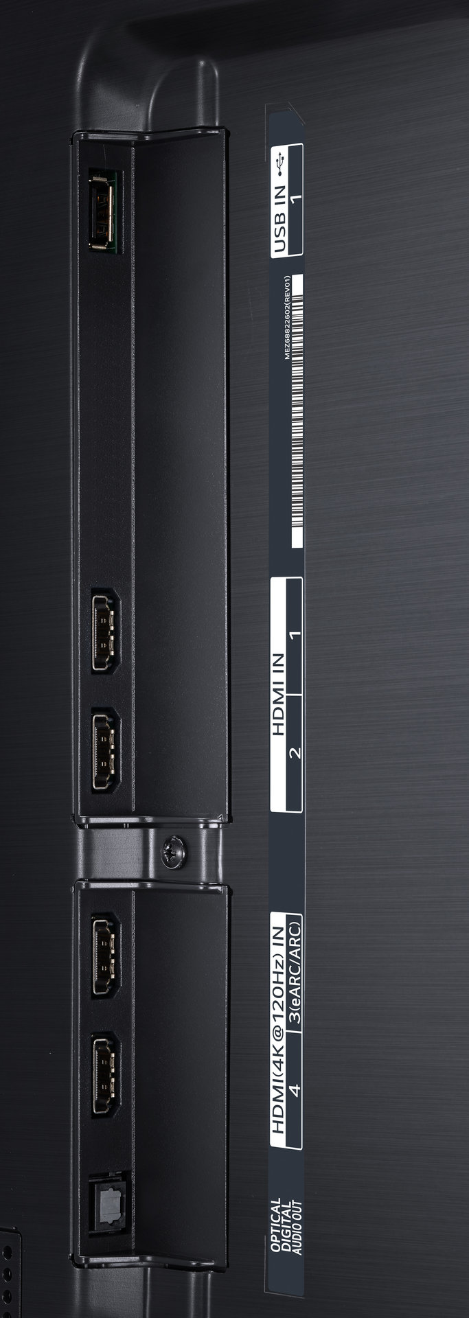 Боковая панель оснащена двумя входами HDMI v.2.1 с поддержкой режима 4К/120Гц (один из которых совместим с ARC, двумя входами HDMI v.2.0 и eARC), одним портом USB (версии 2.0) и слотом условного доступа CI+. Что касается аудио, то на этой же панели расположен оптический аудиовыход, выход 3,5" на наушники/акустику отсутствует.
