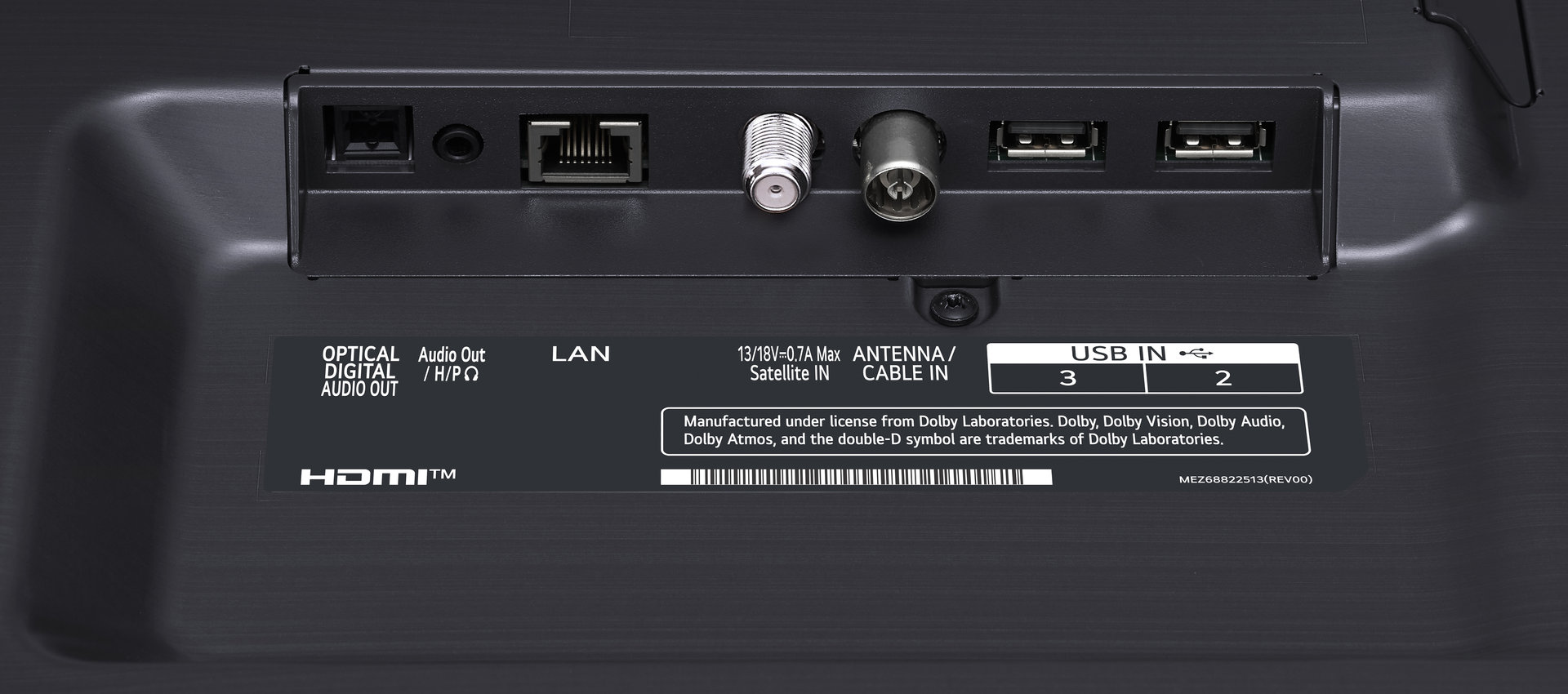 Задняя панель телевизора LG NANO86 оснащена следующими интерфейсами: 2 антенных входа (для спутникового и кабельного/эфирного ТВ), один порт LAN (со скоростью 100 Мбит/сек) и два порта USB (версии 2.0). Что касается аудио, то на этой же панели расположен только оптический аудиовыход и выход 3,5" для наушников.