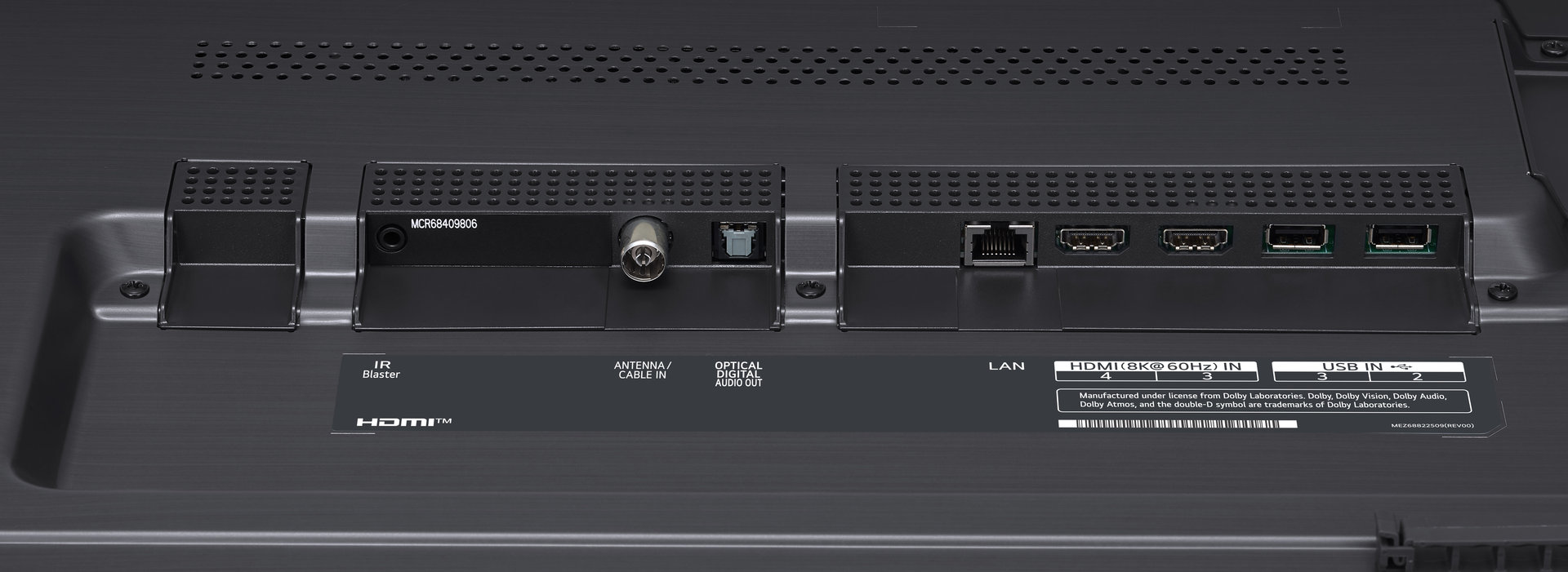 Нижняя панель телевизора LG NANO95 оснащена следующими интерфейсами: два входа HDMI v.2.1 (с поддержкой режима 8К/60 Гц), 2 антенных входа (для спутникового и кабельного/эфирного ТВ), один порт LAN (со скоростью 100 Мбит/сек), два порта USB (версии 2.0) и разъем для подключения ИК-передатчика. Что касается аудио, то на этой же панели расположен оптический аудиовыход.
