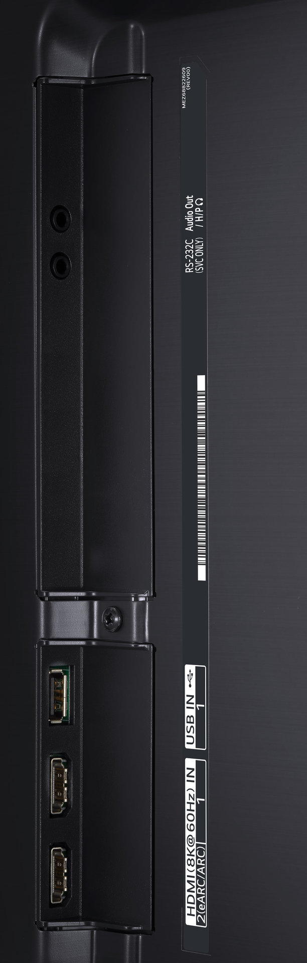 Боковая панель оснащена двумя входами HDMI v.2.1 (один из которых совместим с ARC и eARC), одним портом USB (версии 2.0) и слотом условного доступа CI+. Что касается аудио, то на этой же панели расположен выход 3,5" на наушники/акустику. Кроме того на борту имеются встроенные беспроводные модули Wi-Fi (с поддержкой стандартов 802.11a, 802.11b, 802.11g, 802.11n, 802.11n, 802.11ac, Wi-Fi Direct) и Bluetooth (поддерживается сопряжение с совместимыми устройствами по протоколам Bluetooth 5.0 и apt-X).