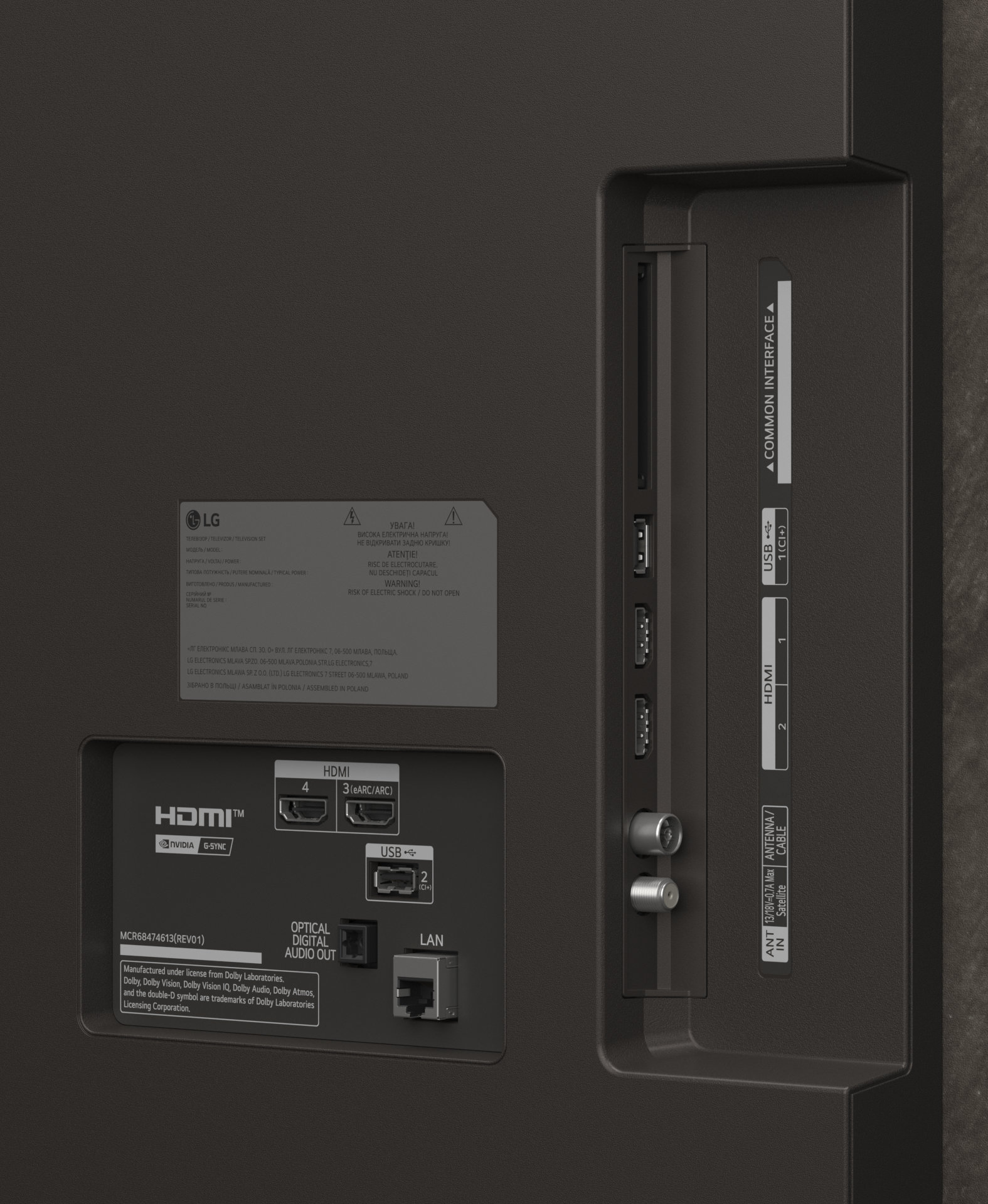 Боковая панель оснащена двумя входами HDMI v.2.1, 2 антенными входами (для спутникового и кабельного/эфирного ТВ), одним разъемом USB 2.0 и слотом условного доступа CI+. Кроме того на борту имеются встроенные беспроводные модули Wi-Fi (с поддержкой стандартов 802.11a, 802.11b, 802.11g, 802.11n, 802.11n 5 ГГц, 802.11ac, 802.11ax, Wi-Fi Direct) и Bluetooth (поддерживается сопряжение с совместимыми устройствами по протоколу Bluetooth 5.3).