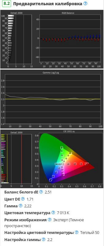 Эти измерения выполняются в режиме изображения «Эксперт (Темное пространство, ночь) », при освещении OLED на «Макс. », пиковой яркости на «Высоком» и цветовой температуре, установленной на «Теплый 50».