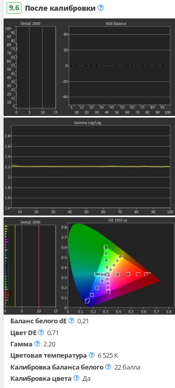 После калибровки точки белого D65 LG C2 OLED имеет почти идеальную точность. Баланс белого и точность цветопередачи почти идеальны, без каких-либо заметных проблем. Цветовая температура очень близка к цели калибровки 6500K, а гамма идеальна для темной комнаты.