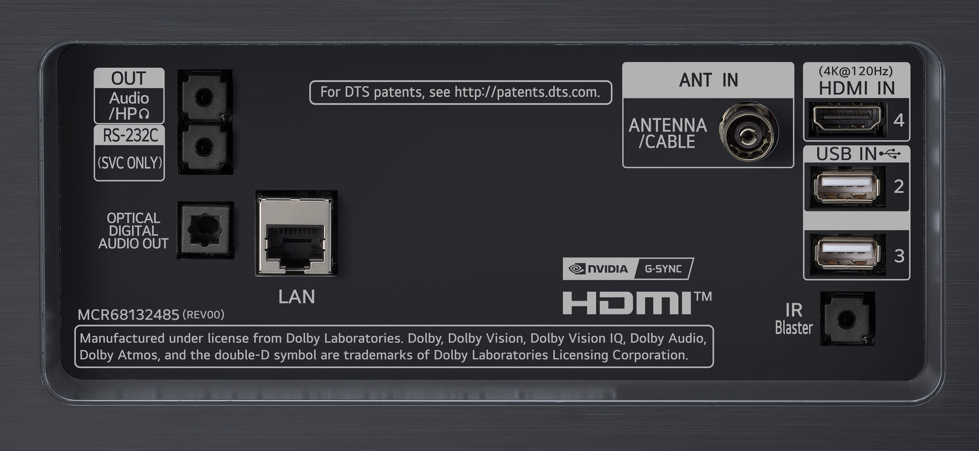 Нижняя панель модели LG 83C3 оснащена следующими интерфейсами: два входа HDMI v.2.1a (с поддержкой режима 4К/120 Гц), 2 антенных входа (для спутникового и кабельного/эфирного ТВ), один порт LAN (со скоростью 100 Мбит/сек), два порта USB (версии 2.0) и порт ИК-передатчика. Что касается аудио, то на этой же панели расположен только оптический аудиовыход.