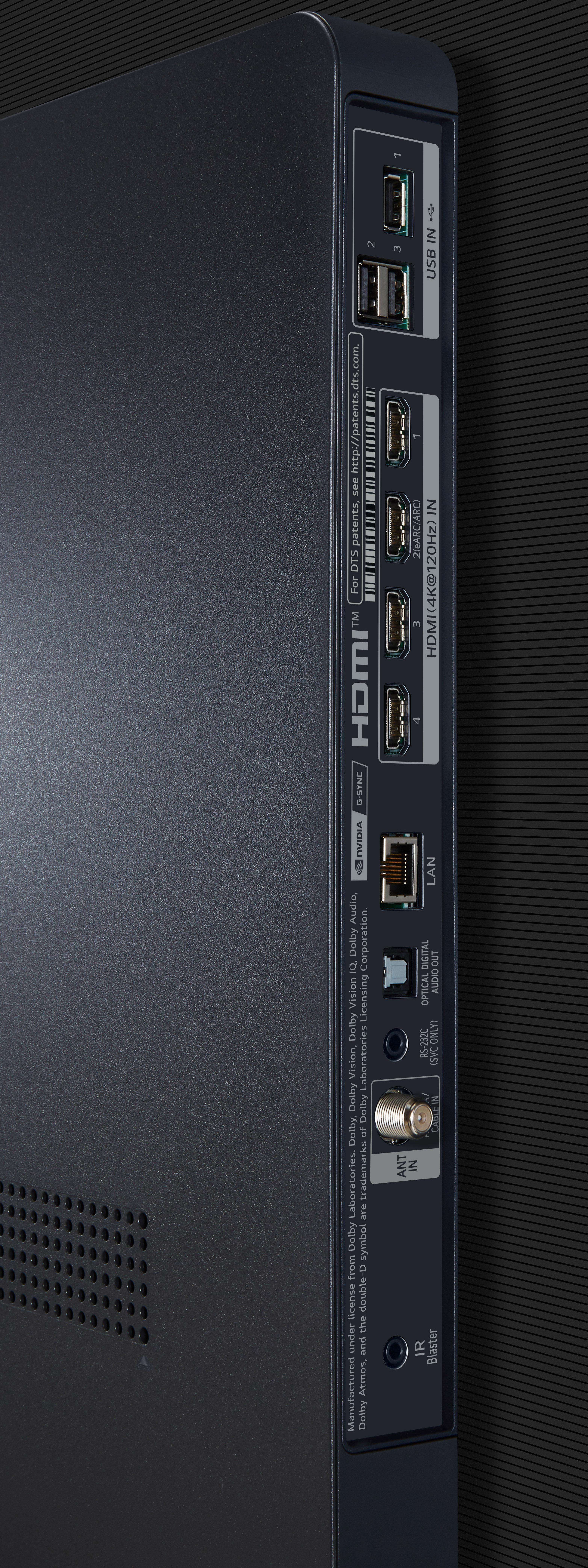 Боковая панель моделей LG 55C3/65C3 оснащена следующими интерфейсами: четыре входа HDMI v.2.1a (с поддержкой режима 4К/120 Гц), 2 антенных входа (для спутникового и кабельного/эфирного ТВ), один порт LAN (со скоростью 100 Мбит/сек), три порта USB (версии 2.0). Что касается аудио, то на этой же панели расположен только оптический аудиовыход.