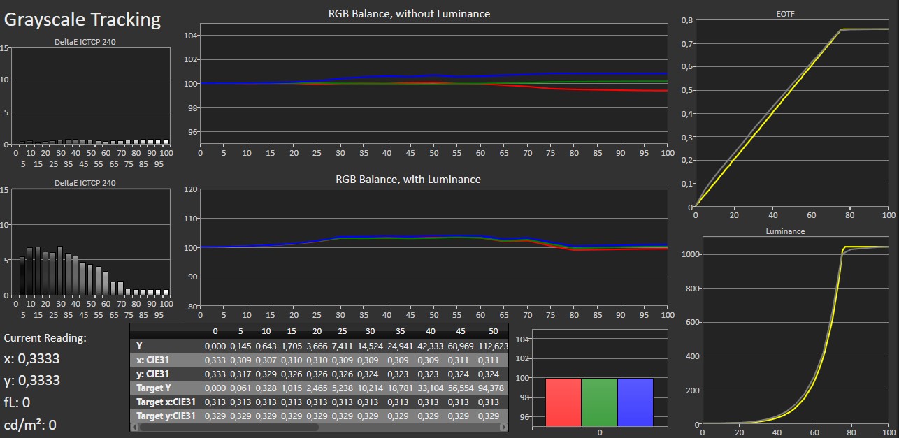 Как видно из графиков, C4 является лучшим игроком, когда дело доходит до точности цветопередачи, и было относительно легко приблизиться к эталону настолько, что отклонений практически не было. В сочетании с высокой яркостью, которую можно регулировать с точностью до пикселя, C4 действительно сияет в отделе изображения. Единственной небольшой проблемой является некоторая полосатость в плавных градиентах, но не в такой степени, чтобы она создавала артефакты постеризации (разбиение градиентов на большие, резко очерченные цветовые блоки) в фильмах с большими цветовыми областями и малым количеством градиентов.