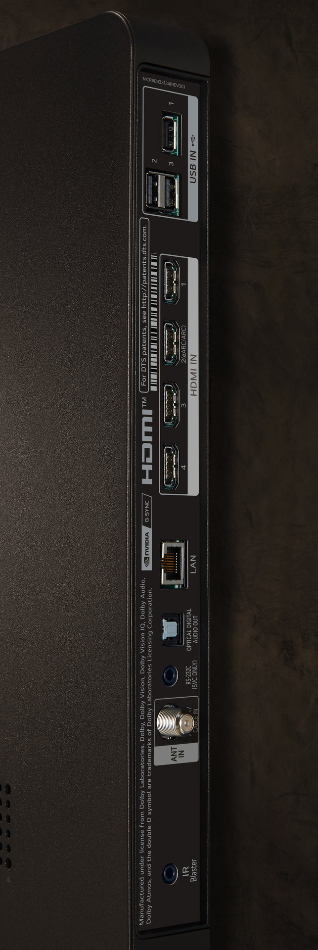 Боковая панель моделей LG 55C4/65C4/77C4 оснащена следующими интерфейсами: четыре входа HDMI v.2.1a (один из которых совместим с ARC и eARC), 2 антенных входа (для спутникового и кабельного/эфирного ТВ), один порт LAN (со скоростью 100 Мбит/сек), три порта USB (версии 3.0). Что касается аудио, то на этой же панели расположен только оптический аудиовыход.