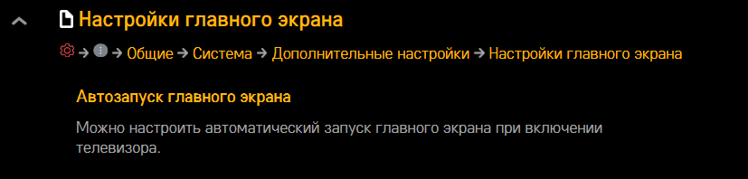 Это значит отключен автоматический запуск (=принудительное появление при каждом включении ТВ на его экране) Главного экрана, отключается в настройках так