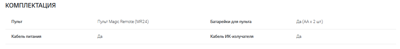 Какая комплектация/чего? В целом для любой модели - на сайте производителя https://www.lg.com/ru/televisions/lg-oled65g4rlaКонкретно для G4 (подставка или родной подвес) - заложено в маркировке (обозначении модели), индексы (последние) S или W (соответственно) в трехбуквенном коде для европейского производства, но для EAC-региона они все без подставки будут.ftr061 писал(а):Подскажите, пожалуйста, где указывается комплектация?