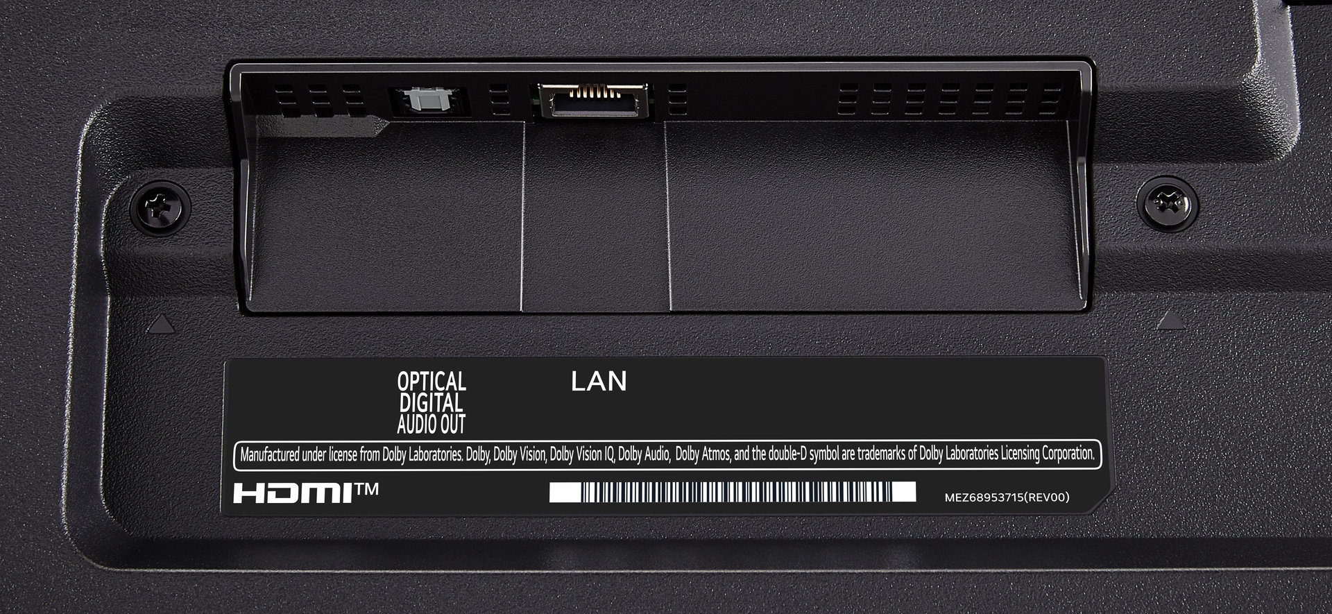 Задняя панель телевизора LG QNED80 оснащена следующими интерфейсами: один порт LAN (со скоростью 100 Мбит/сек). Что касается аудио, то на этой же панели расположен только оптический аудиовыход, выход 3,5" для наушников отсутствует.