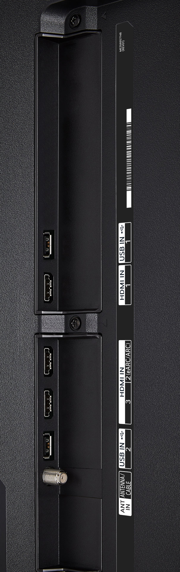 Боковая панель оснащена тремя входами HDMI v2.0 (один из которых совместим с ARC и и eARC), двумя разъемами USB 2.0, 2 антенными входами (для спутникового и кабельного/эфирного ТВ) и слотом условного доступа CI+.