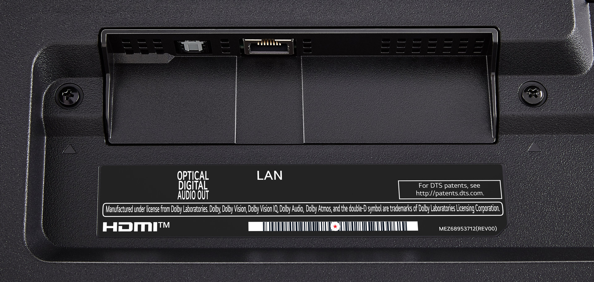 Задняя панель телевизора LG QNED87 оснащена следующими интерфейсами: один порт LAN (со скоростью 100 Мбит/сек). Что касается аудио, то на этой же панели расположен только оптический аудиовыход, выход 3,5" для наушников отсутствует.