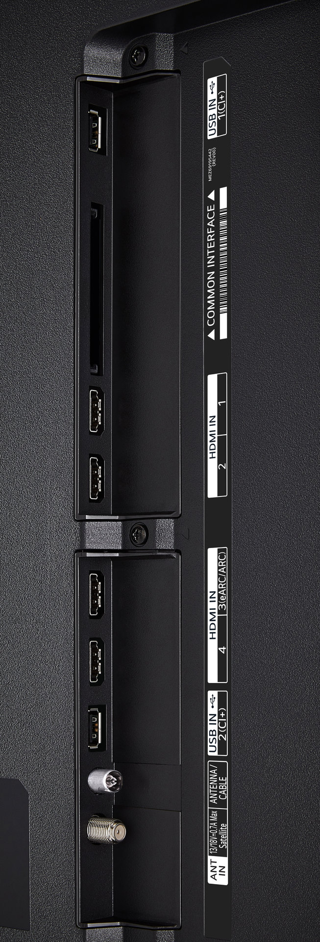 Боковая панель оснащена двумя входами HDMI v2.1 (один из которых совместим с ARC и eARC), двумя входами HDMI v2.0, двумя разъемами USB 2.0, 2 антенными входами (для спутникового и кабельного/эфирного ТВ) и слотом условного доступа CI+.