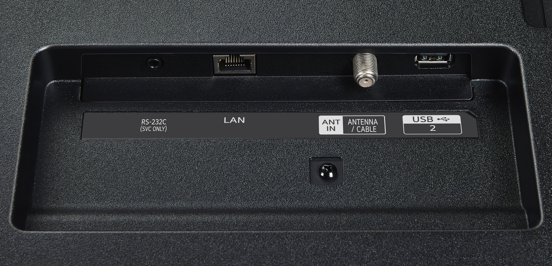 Задняя панель модели LG QNED92 оснащена следующими интерфейсами: один порт LAN (со скоростью 100 Мбит/сек), 1 порт USB 2.0. и 2 антенных входа (для спутникового и кабельного/эфирного ТВ).
