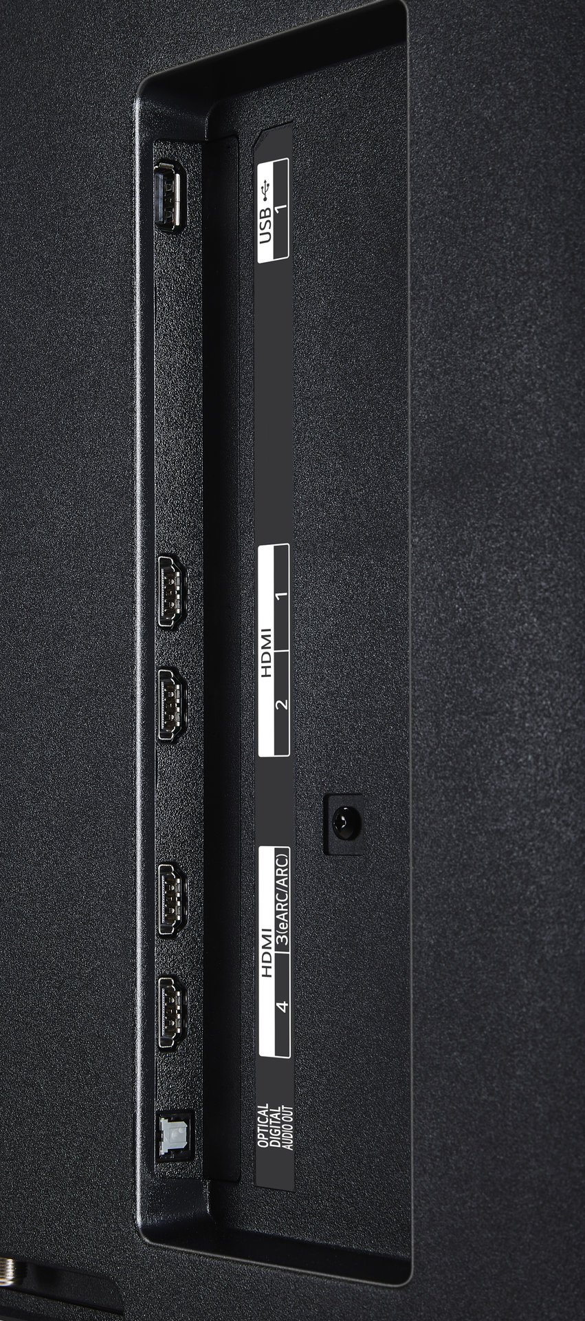 Боковая панель оснащена четырем входами HDMI v2.1 (один из которых совместим с ARC и eARC), одним разъемом USB 2.0 и слотом условного доступа CI+. Что касается аудио, то на этой же панели расположен только оптический аудиовыход, выход 3,5" для наушников отсутствует.