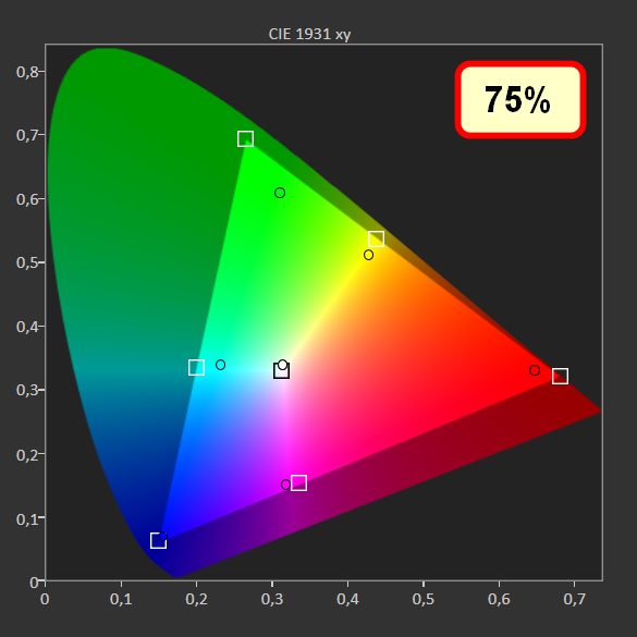 Покрытие пространства UHDA-P3 (CIExy) составило 75%, что означает поддержку стандартной, а не расширенной или широкой цветовой палитры.