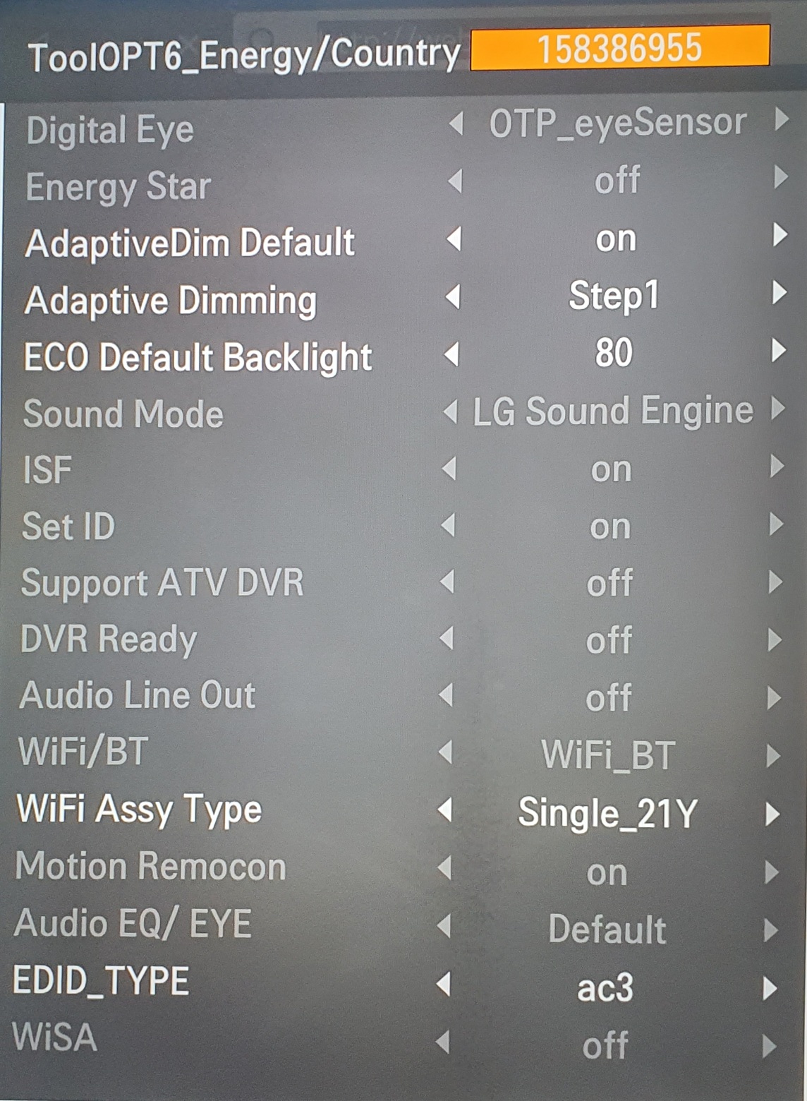 Я получил от вас, оказывается еще не все данные))) В сервисном меню у себя, я походу поменял все, что менялось. Теперь мне нужны настройки из меню White balance, причем всех трех параметров Подпункта color temp (cool, medium, warm). Только не нажимайте там RESET, как сделал я...))) Да, кстати указатель пульта стал двигаться. Причина оказалось в том, что при смене региона, слетела и прошивка самого телека на 03.21.00. Автоматические обновления не устанавливались. Скачал прошивку 03.21.20 с оф. сайта на флеху и указатель зашевелился.