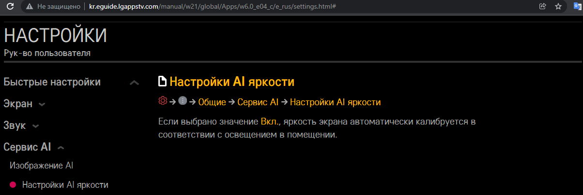 Руководства пользователя (модели 2021 г. нет на руках) "Экономия энергии" может подстраивать пиковую яркость экрана в зависимости от условий освещенности (автоматически) или работать по предустановленным уровням яркости и контрастности, выбираемым в ручную (минимум, среднее, максимум)