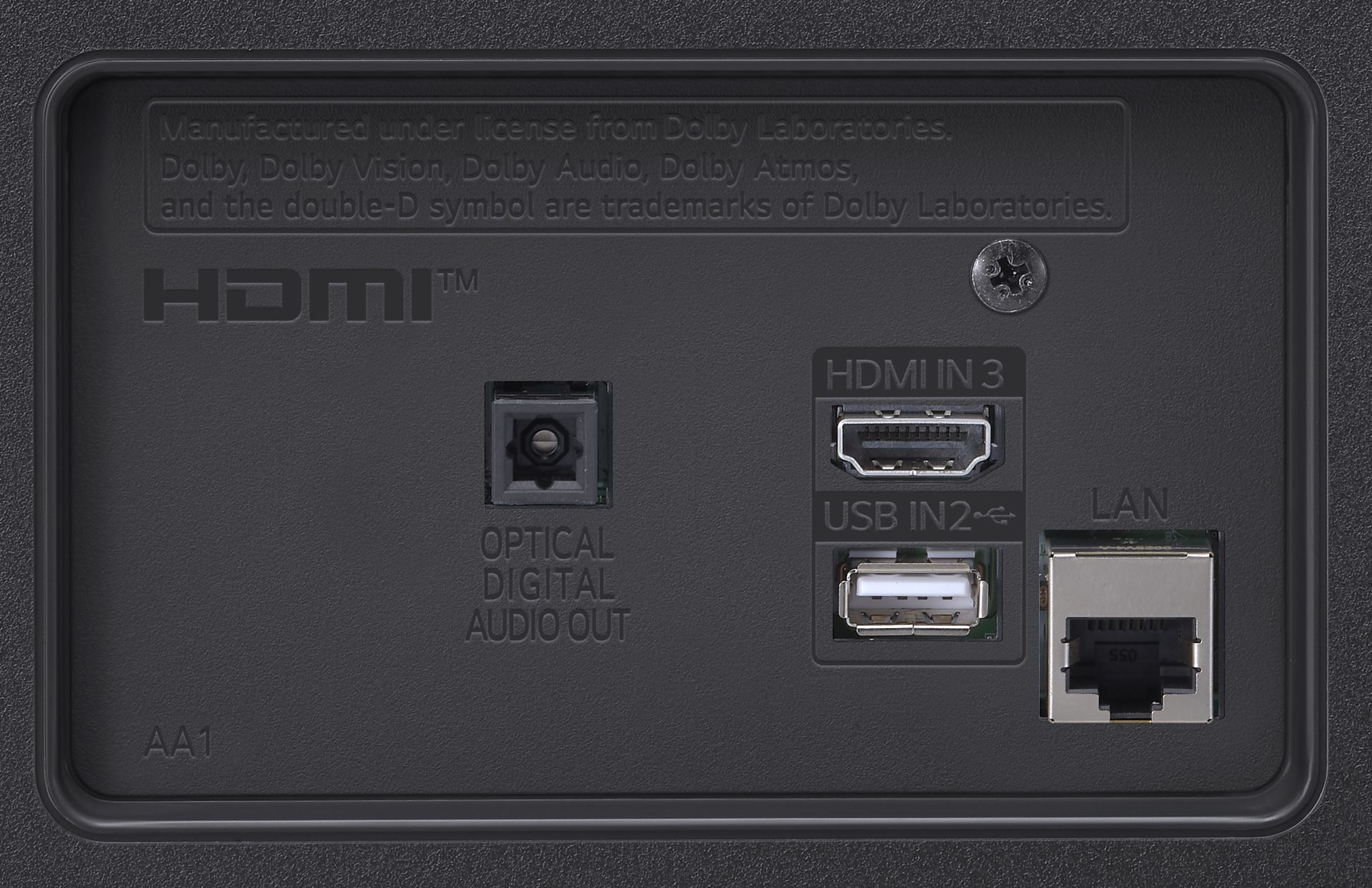 Задняя панель моделей 43UP8100, 50UP8100, 55UP8100, 60UP8100, 65UP8100, 70UP8100, 75UP8100 оснащена следующими интерфейсами: один вход HDMI, один порт LAN (со скоростью 100 Мбит/сек) и один порт USB (версии 2.0). Что касается аудио, то на этой же панели расположен только оптический аудиовыход, выход 3,5" для наушников отсутствует.