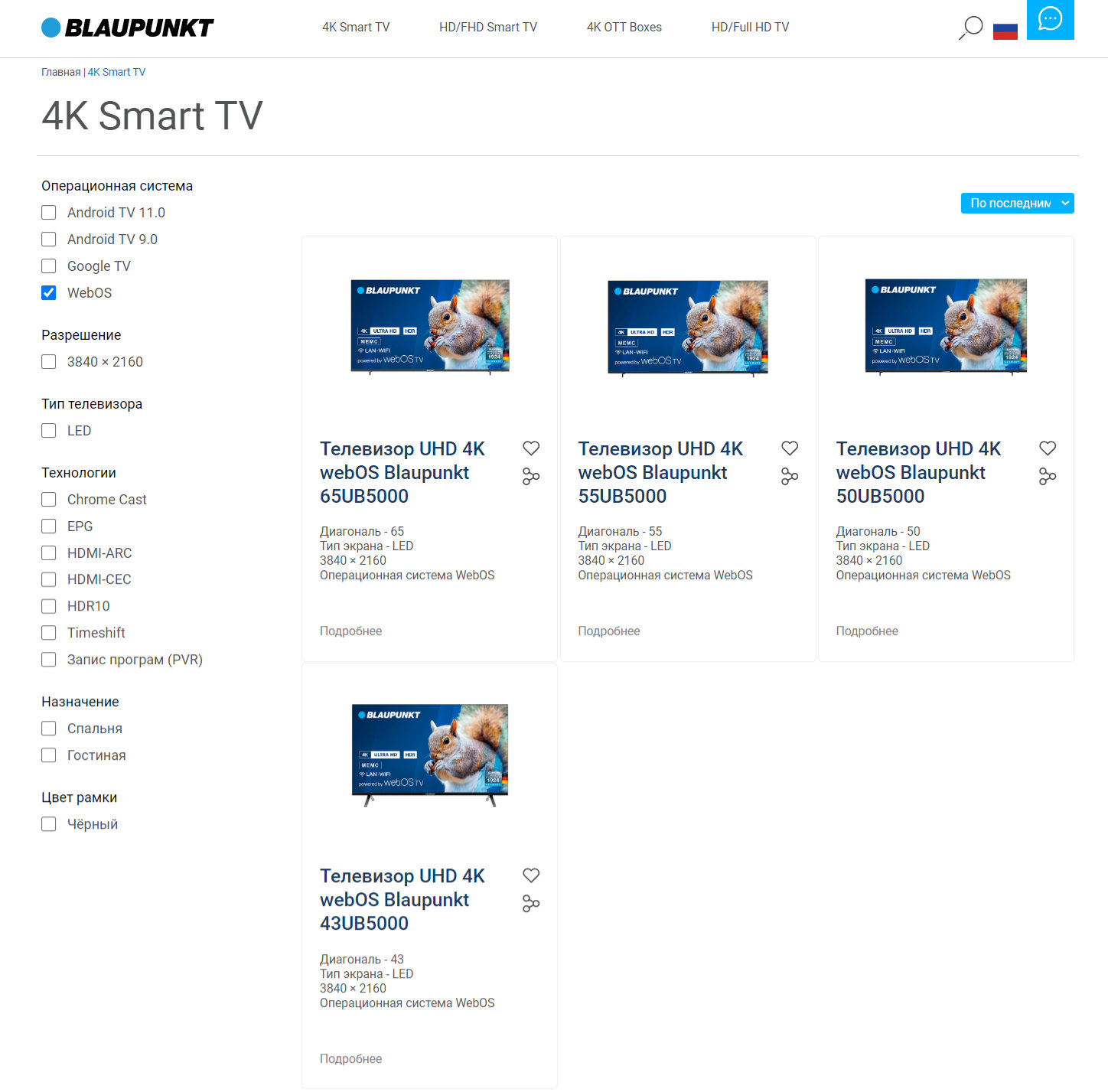 Господа из российского офиса Blaupunkt любезно сообщают на своём российском сайте о наличии целых 4 (!) моделей телевизоров на платформе webOS.