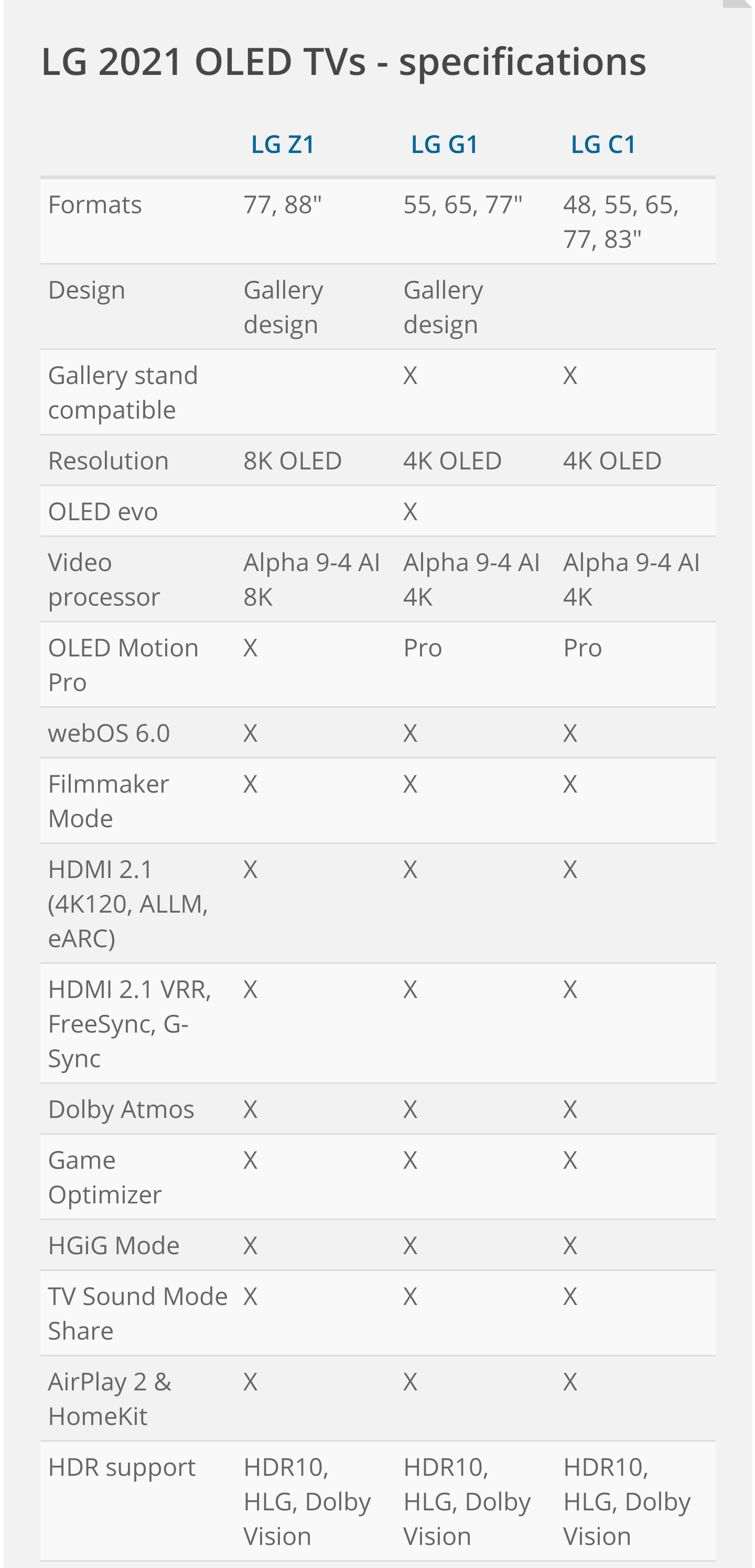 Мы разбиваем линейку OLED-телевизоров LG 2021 года, которая состоит из LG C1, G1 с более яркой OLED-панелью Evo и 8K Z1 OLED-телевизоров. C1, G1 и Z1 будут оснащены процессором AI Alpha 9 поколения 4, а также четырьмя портами HDMI 2.1 с ALLM, VRR (включая поддержку G-SYNC и Freesync Premium), eARC и 4K при 120 Гц, функцией Game Optimiser, WebOS.6.0, поддержка Google Stadia (ожидается во второй половине 2021 года, а не в первом квартале 21 года, как сообщалось), а также обновленный пульт Magic Remote. LG C1 будет доступен с пятью размерами экранов: 48-дюймовым OLED48C1, 55-дюймовым OLED55C1, 65-дюймовым OLED65C1, 77-дюймовым OLED77C1 и 83-дюймовым OLED83C1. LG G1 будет оснащен обновленной панелью OLED Evo, в которой используется недавно разработанный материал OLED для достижения более высокой пиковой яркости. Он будет доступен с тремя размерами экрана, а именно с 55-дюймовым OLED55G1, 65-дюймовый OLED65G1 и 77-дюймовый OLED77G1. В зависимости от вашего региона также могут быть более доступные модели LG A1 (60 Гц, HDMI 2.0) или LG B1 (120 Гц, HDMI 2.1). Оба будут использовать пониженный процессор Alpha 7 поколения 4.