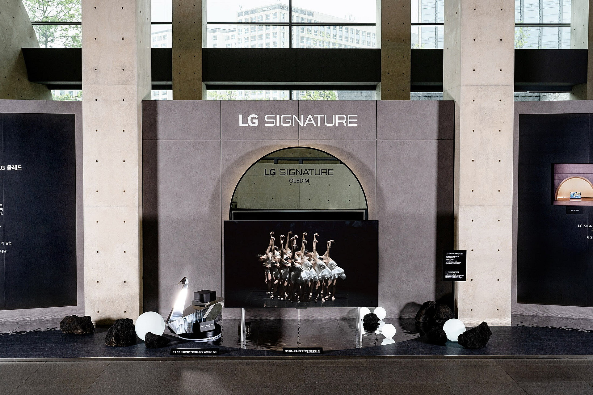 На выставочной зоне на фоне, напоминающем темное озеро, демонстрируется LG SIGNATURE OLED M (модель M3), первый беспроводной OLED телевизор. Этот особенный дисплей благодаря использованию беспроводного решения, напоминает образы лебедей, элегантно скользящих по поверхности воды. Дополняющий телевизор блок Zero Connect, отвечающий за беспроводную передачу видео- и аудиосигналов на кинематографический экран LG, расположен за экраном на скульптуре лебедя, добавляя художественный штрих к экспозиции. В специальной выставочной зоне OLED M настенные панели, простирающиеся с обеих сторон, демонстрируют путь инноваций в телевизорах LG OLED за последние 10 лет. Стенд также представляет философию бренда LG SIGNATURE с девизом «Искусство сущности», и тему бренда «LIVE BEYOND», подчёркивающую опыт превращения жизни в искусство.