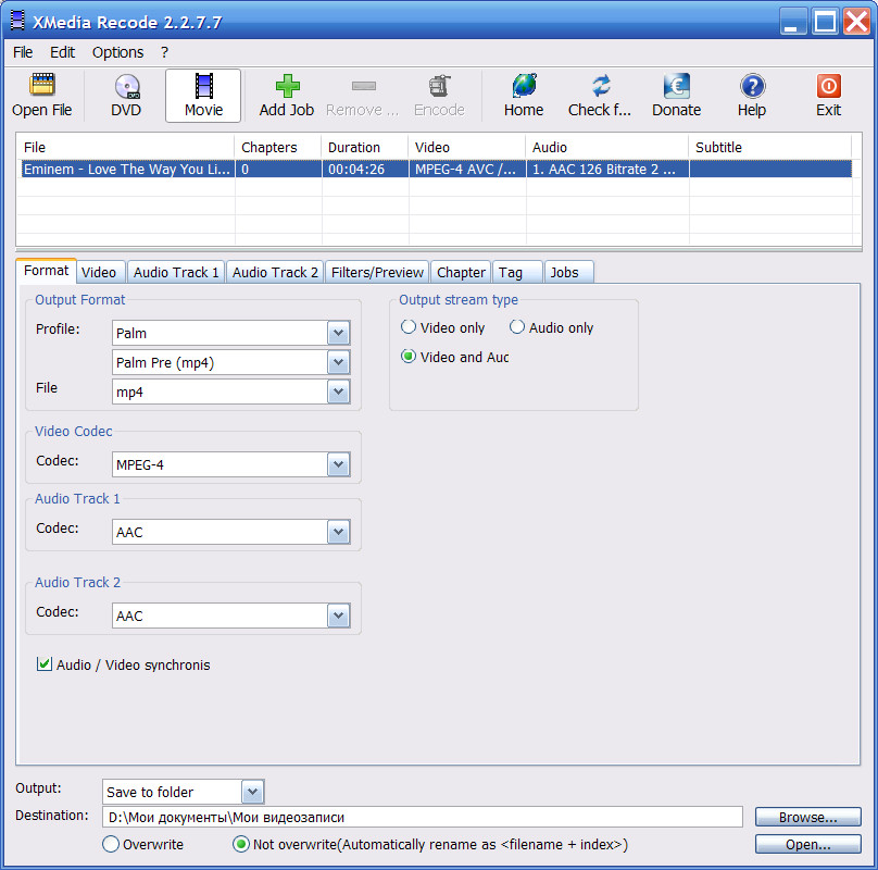 http://www.xmedia-recode.de/download.htmlЕсть специальный профиль под Palm Pre. Перетаскиваем из проводника видео-файл на панель программы и конвертируем. Для опытных пользователей есть доп. настройки.
