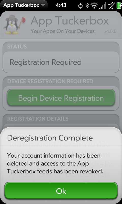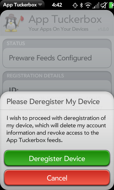 App Tuckerbox в настоящее время находится в стадии публичного бета-тестирования. Чтобы получить право стать частью группы бета-тестирования, вы должны купить не менее 50 webOS приложений (используйте Preware -> Impostah -> App Catalog -> Show Purchased Apps для определения числа приобретенных приложений).