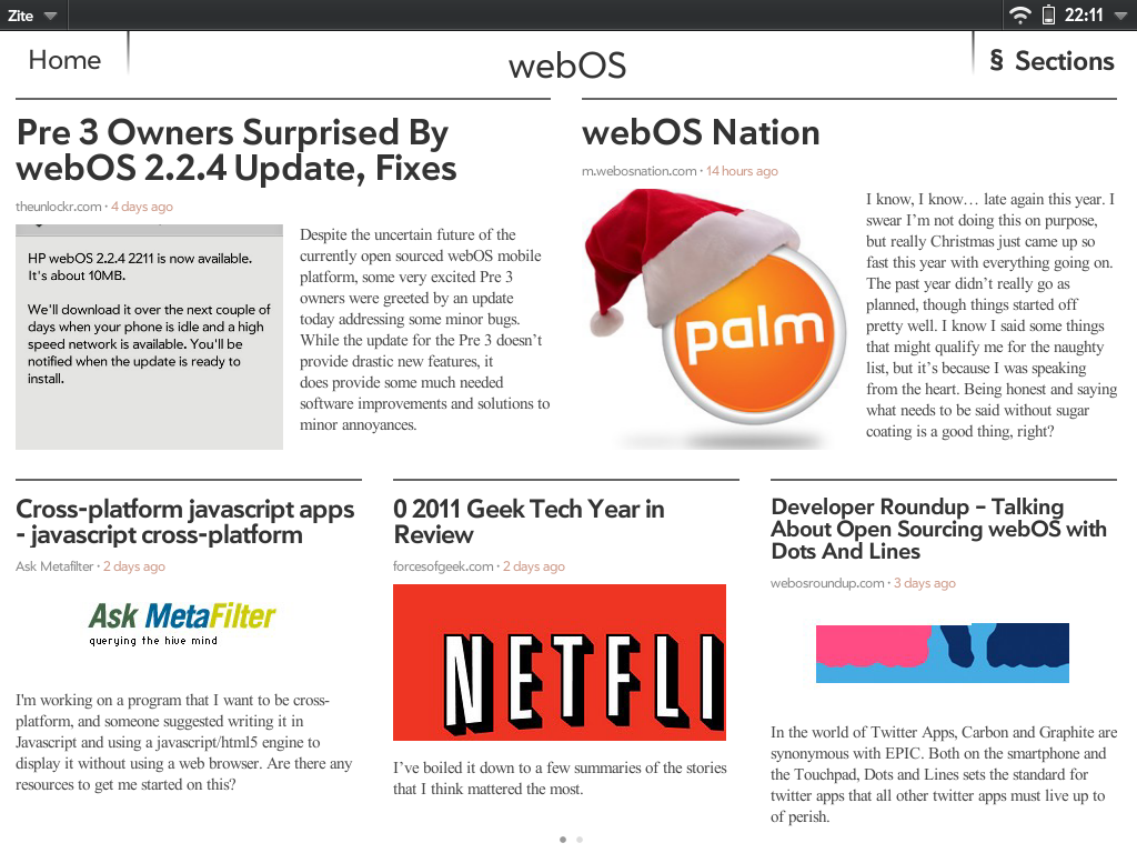 Описание: Приложение Zite – бесплатный инструмент для чтения новостей на HP TouchPad, который структурирует ленту материалов на основе анализа пользовательского поведения. Система учитывает, какие материалы человек уже читал, "следя" за его лентой в Twitter, обновлениями в Google-ридере и других новостных агрегаторах. Как результат – для пользователя отбирают интересные лично ему новости (в соответствии с интересами), которые он, скорее всего, еще не читал, фильтруя все лишнее (что удобно в современном перенасыщенном информацией мире, когда пользователи ищут не контент, а возможности от него спрятаться).