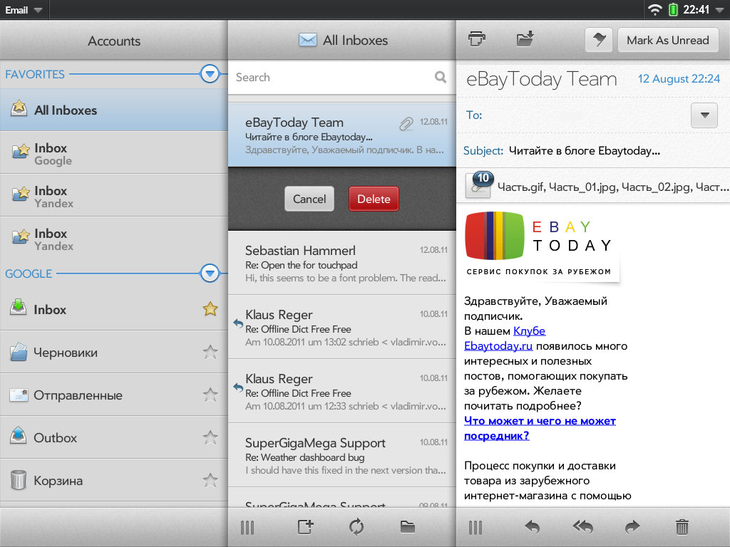 Когда была выпущена первая версия webOS 1.0, реализованный в ней жест управления "сдвинь-для-удаления" (swipe-to-delete) стал одним из самых важных для эффективного использования системы. А как еще быстрее и проще удалить элементы из списков? Несмотря на то, что webOS 3.0 была добавлена возможность мульти-выборки (например, удаление нескольких email'ов), "сдвинуть-для-удаления" все ещё играет очень важную роль в управлении множеством приложений для TouchPad.