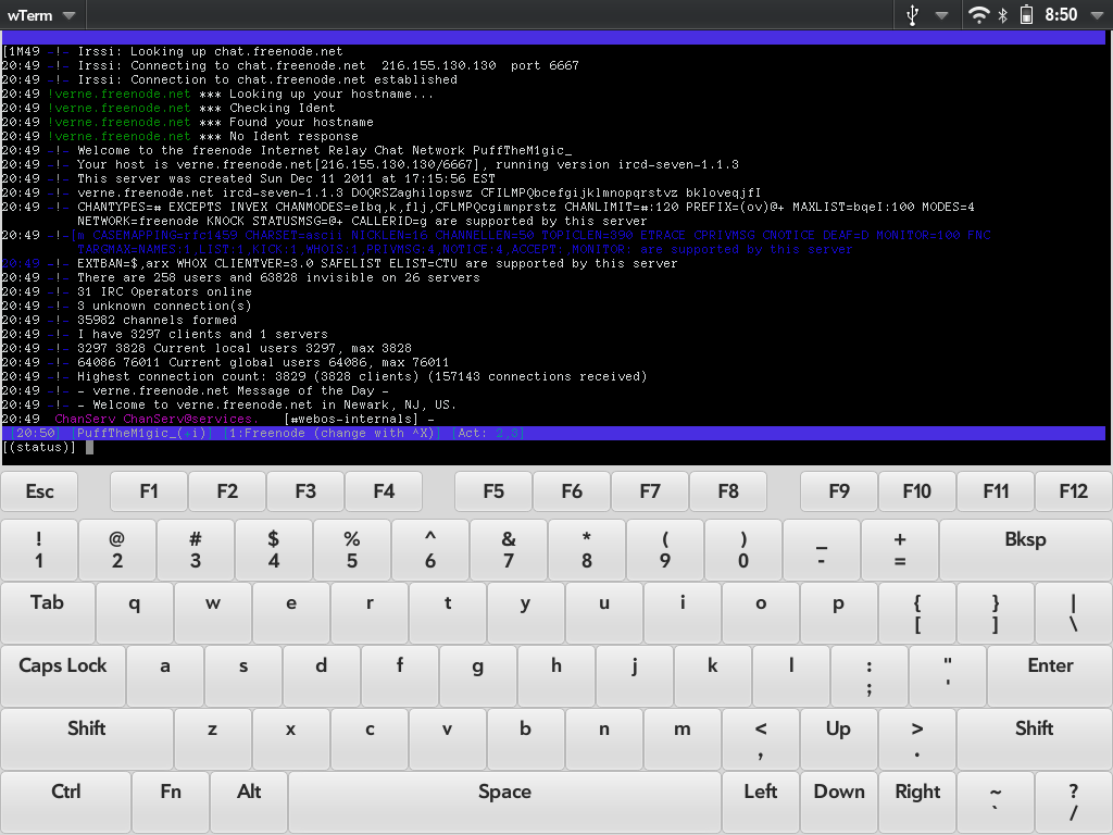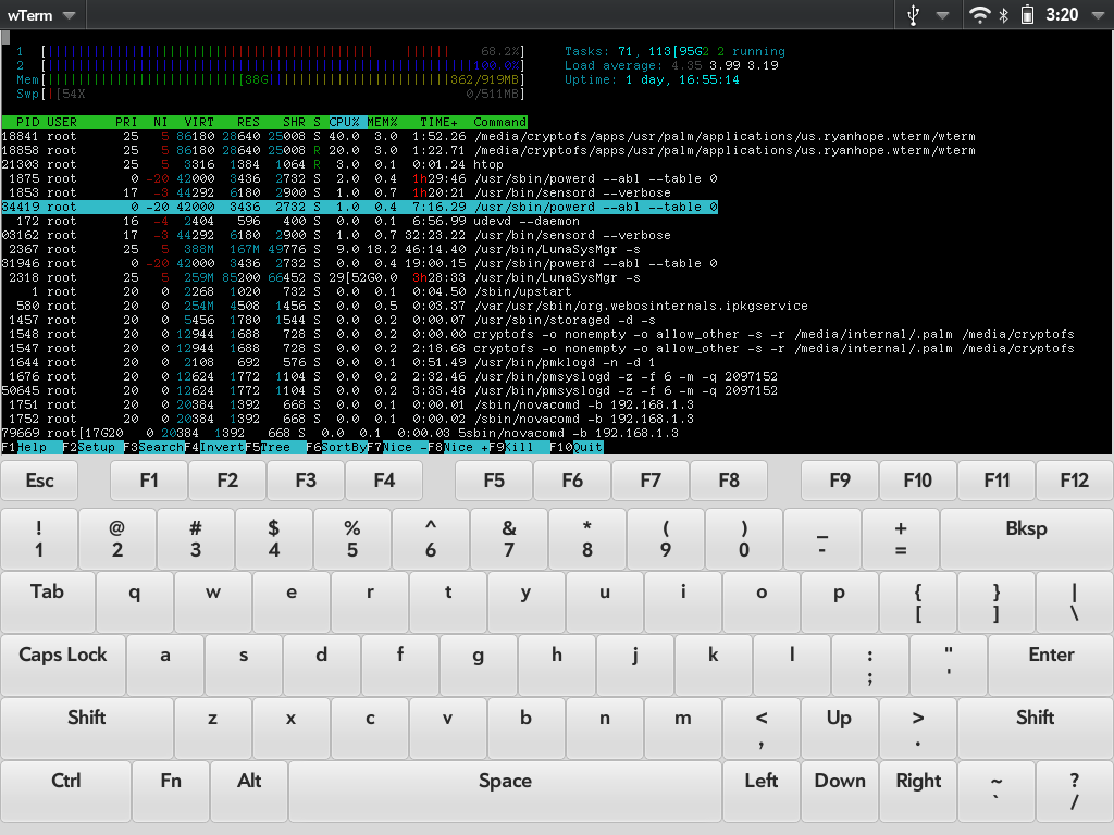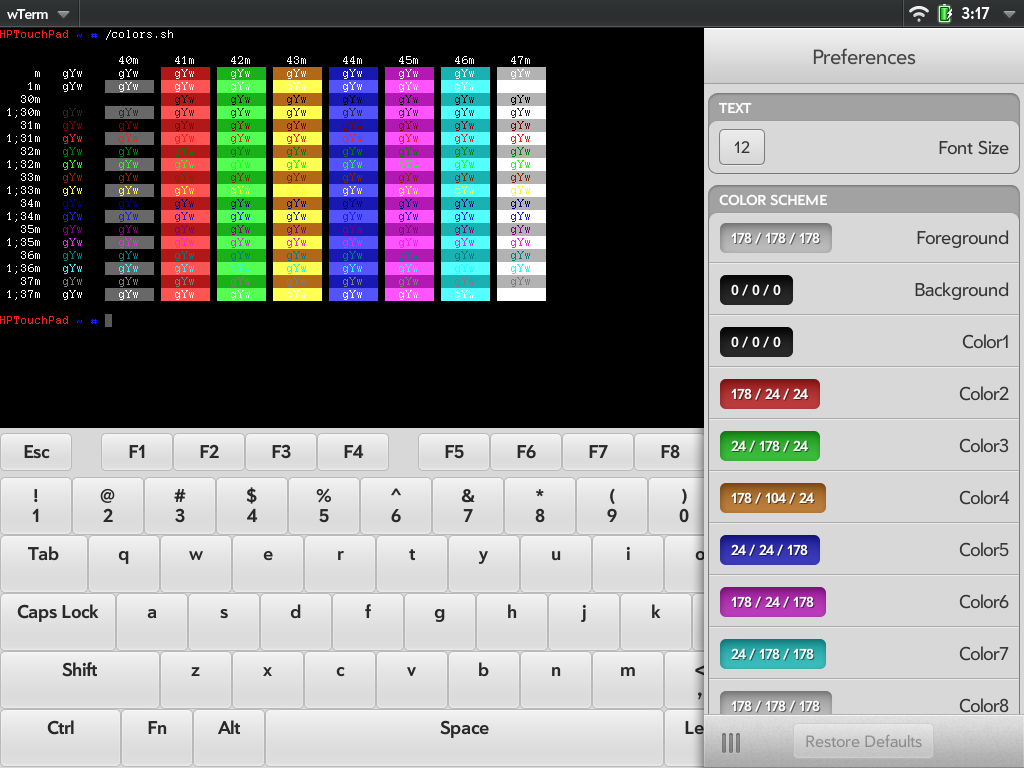Описание: wTerm - это бесплатная программа, представляющая собой эмулятор linux-терминала и предназначенная для использования в среде webOS. wTerm является гибридным приложением (PDK/Enyo), оптимизированным для HP TouchPad (планируется поддержка телефонов ). wTerm поддерживает собственную виртуальную клавиатуру с 74 клавишами, среди которых Ctrl, Alt, Fn, ESC, стрелки и функциональные клавиши. wTerm также поддерживает аппаратное ускорение (то есть работает очень быстро) и настраиваемый размер шрифта.